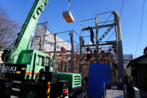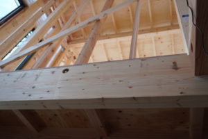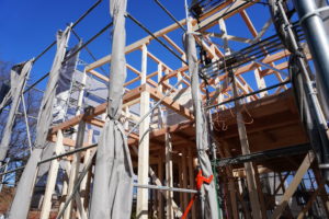 図太い柱やのきが各所に入っています。壁で覆われると全く分からなくなってしまいますが、こうやって建築過程が見られると安心、安心。