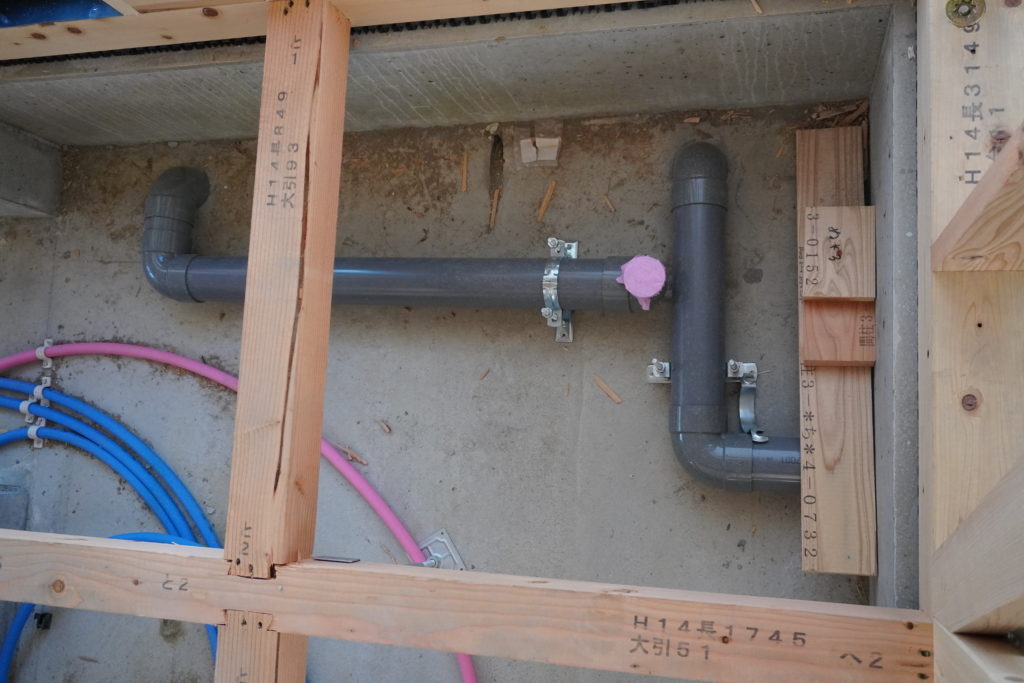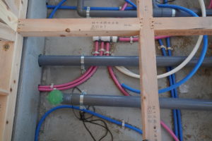 水道やいろいろな配管も見られます。建築の手順は、毎日毎日、いろいろなプロの作業の方々がきて、スケジュール組みが大変です。