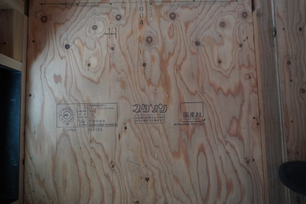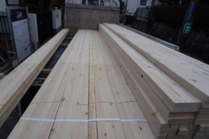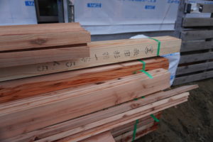 今回の材木は、すべて国産木材です。秋田杉特1等の刻印があります。材料からこだわっている建築会社です。コロナ禍の資材不足は関係なさそう。